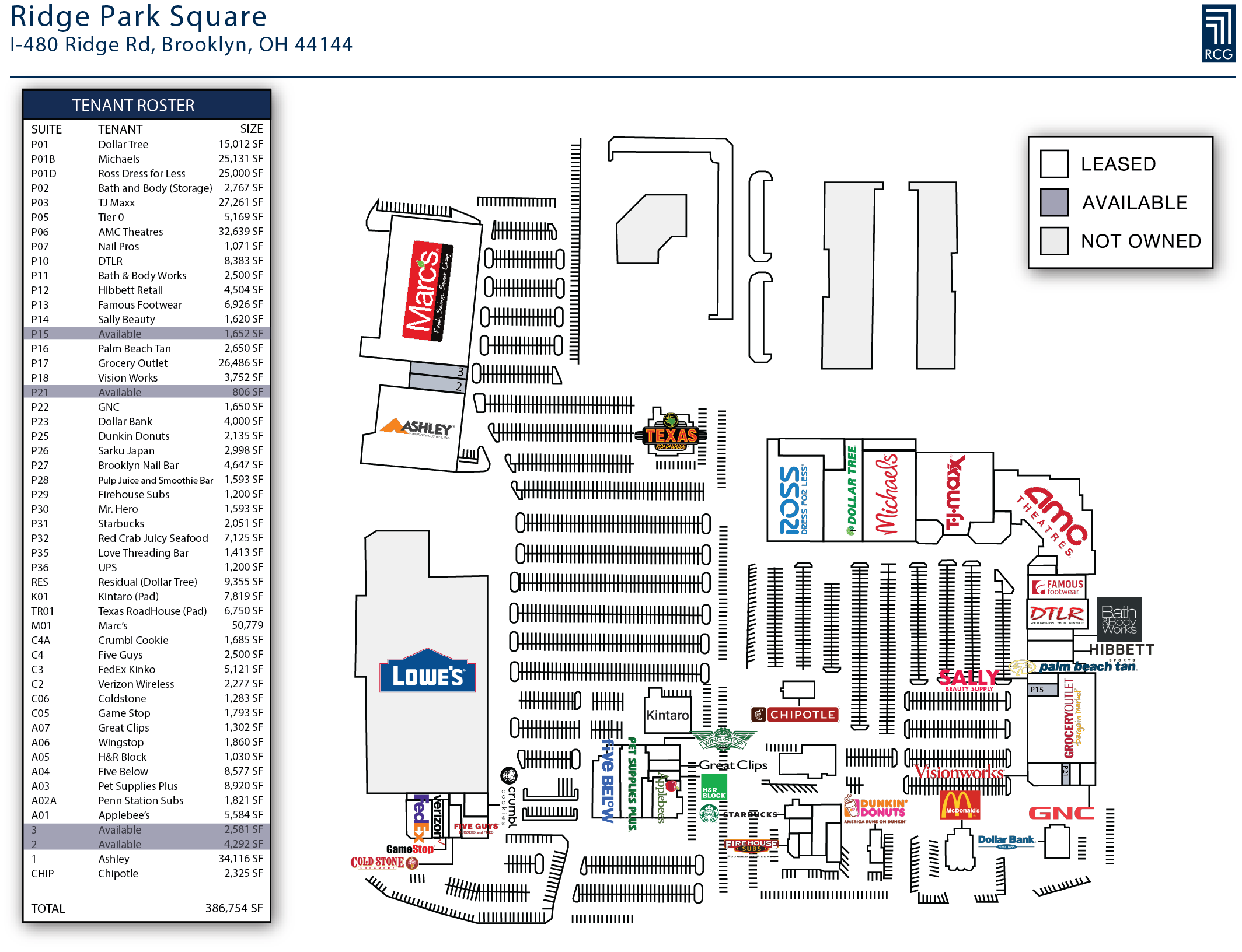 Ridge Park Square is 386,754 SF grocery-anchored center located in Brooklyn, OH (Cleveland MSA). The Center is 95% occupied and is anchored by Marc’s Grocery, Grocery Outlet, Ross Dress for Less, TJ Maxx, Dollar Tree, AMC Theatres, and Michaels. The Center is shadowed by Lowe’s and located in a main retail submarket that includes Menards, Walmart, Sam’s Club, Home Depot, and Best Buy. The Center has dense surrounding demos (3-mile Pop:146k) with strong traffic counts (Ridge Road = 35K VPD) and benefits from an I-480 (132K VPD) interchange that feeds into Ridge Road and the center’s multiple points of ingress and egress.